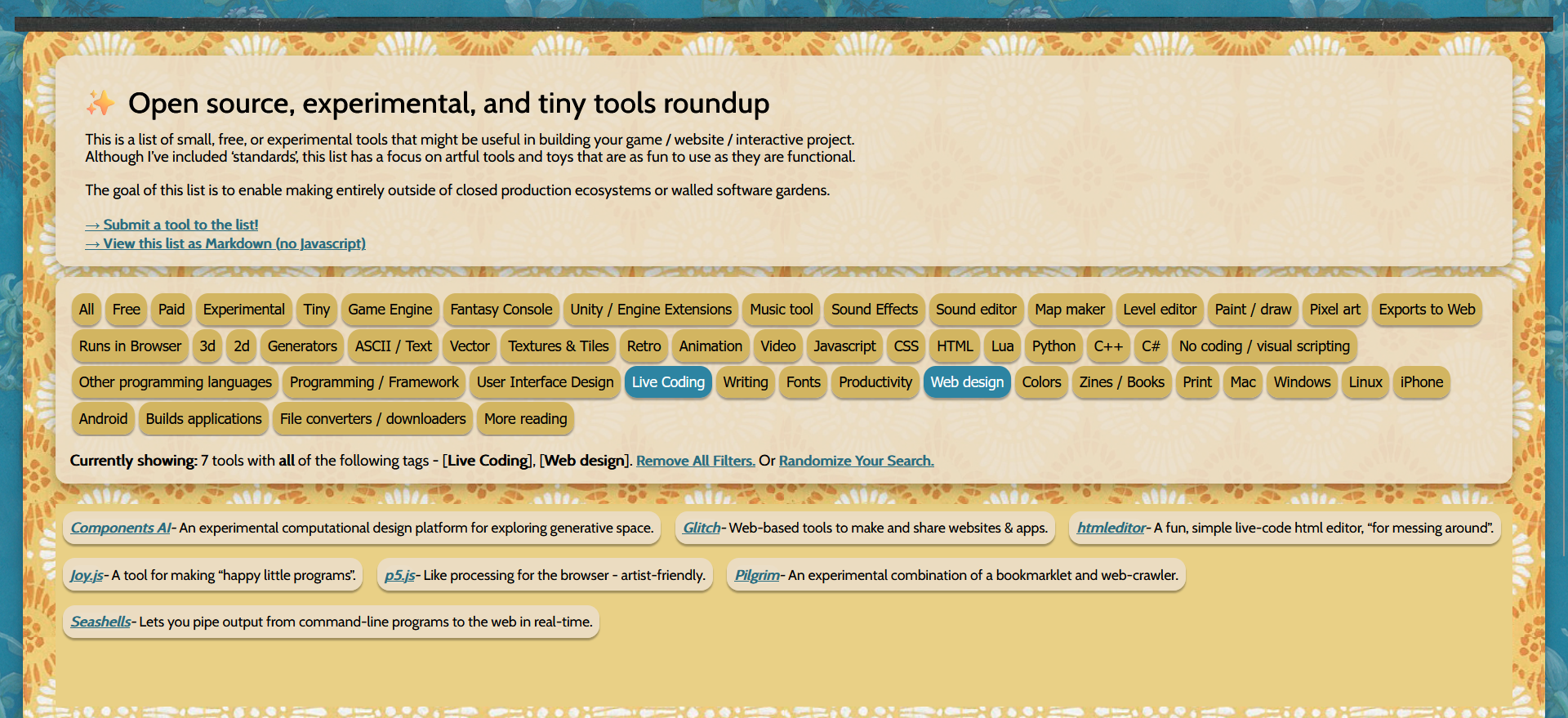 🡱 Tiny Tools est une liste de petits outils gratuits et expérimentaux qui peut être utiles pour la création de jeu/site Web/projet interactif.