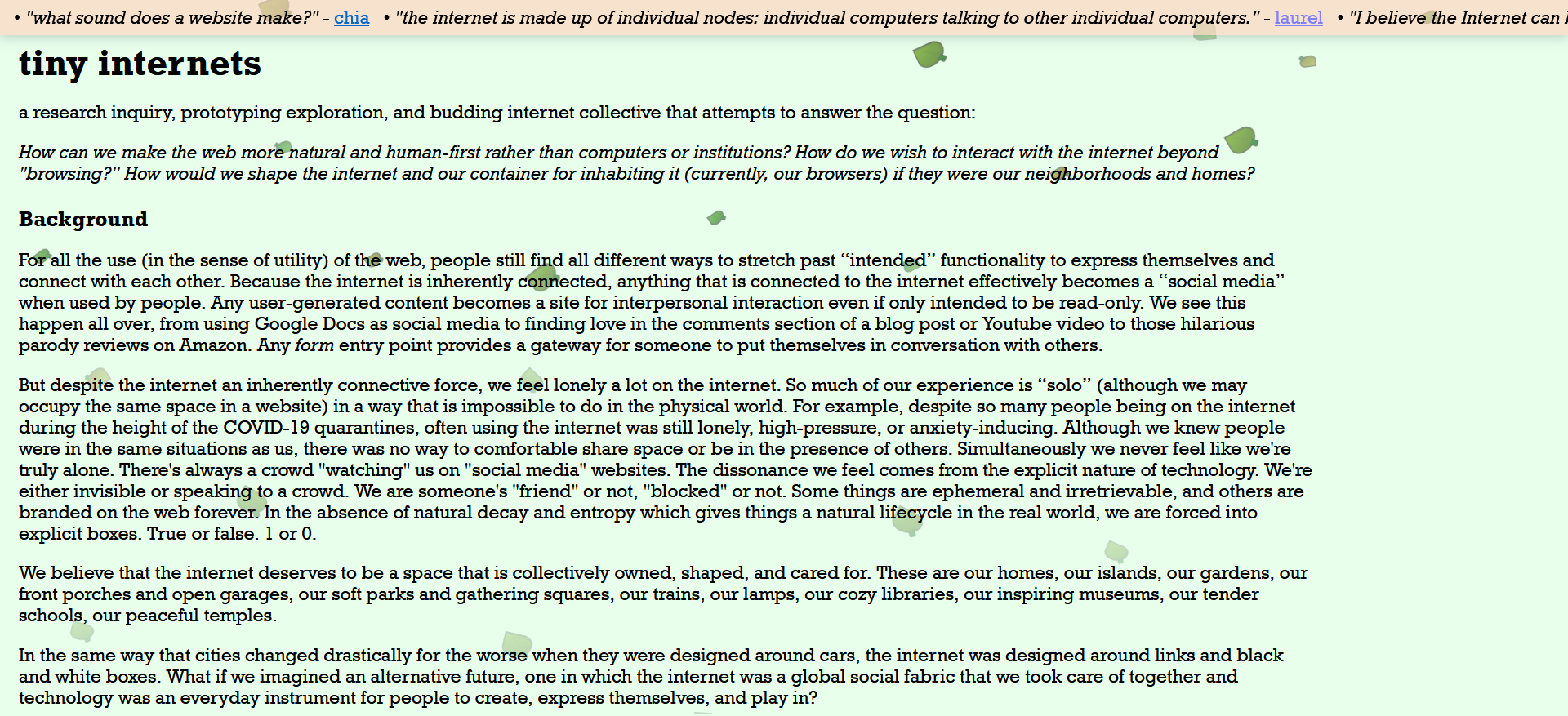 🡱 Tiny Internets une enquête de recherche, une exploration de prototypage et un collectif Internet naissant qui tente de répondre à la question : Comment pouvons-nous rendre le Web plus naturel et plus humain plutôt que les ordinateurs ou les institutions ? Comment souhaitons-nous interagir avec Internet au-delà de la «navigation» ? Comment façonnerions-nous Internet et notre conteneur pour l’habiter (actuellement, nos navigateurs) s’ils étaient nos quartiers et nos maisons ?